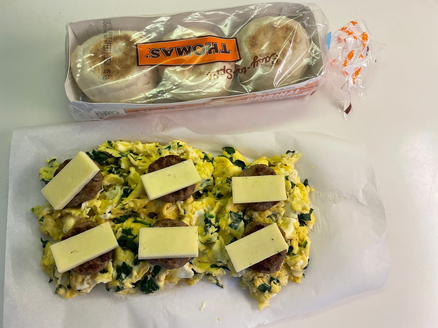 Whatever way feels easiest to you, scramble up a dozen eggs, cheese, some greens, onions, tomatoes, or peppers, and sausage. Let cool before wrapping. Pop in your freezer and save for sandwiches in the future, or use them as breakfast this week.