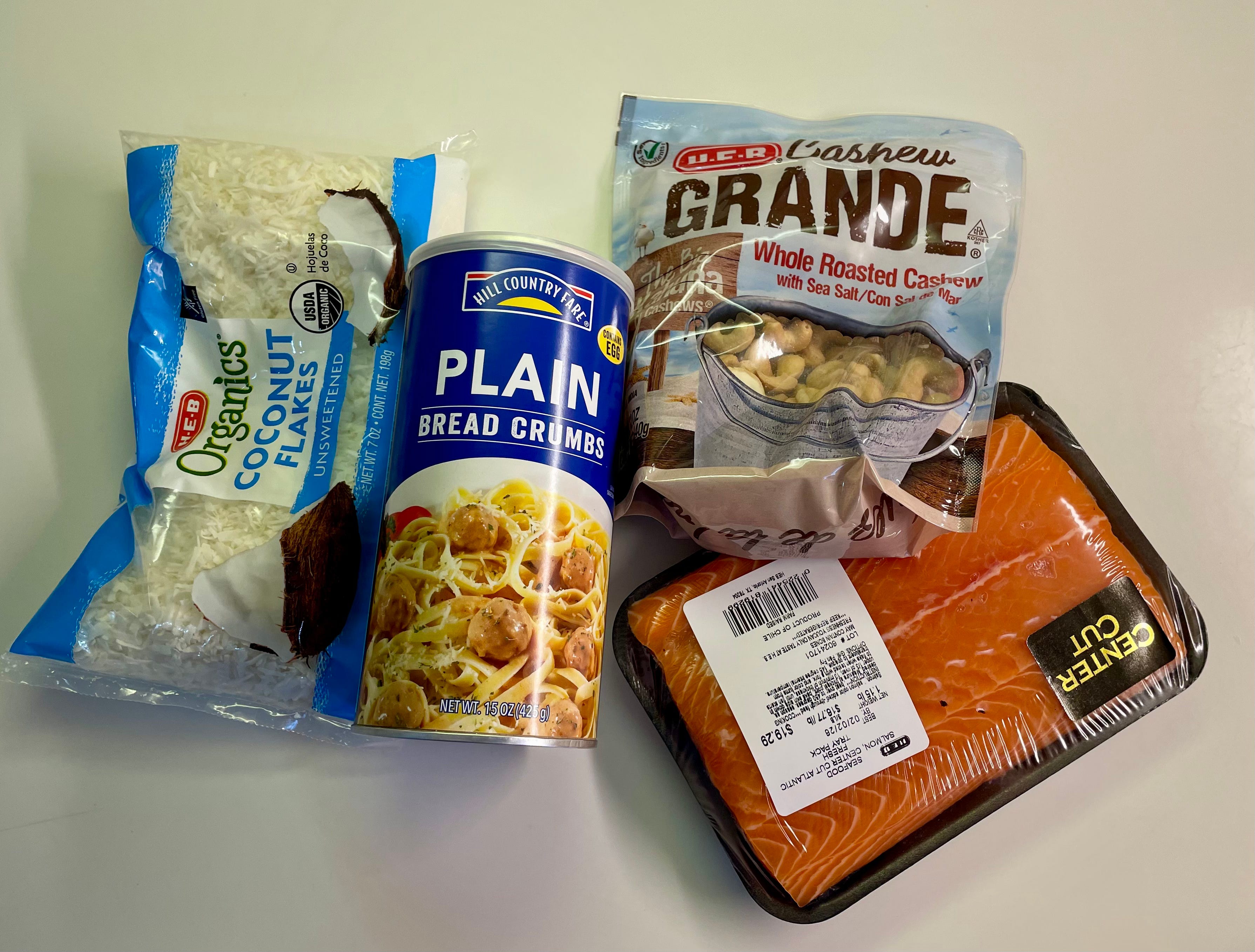 Add equal parts bread crumbs, cashews, and coconut flakes to a food processor or blender, plus 2-3 TBSP olive oil. Mix or Chop.