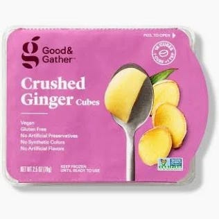 8 oz milk or soy milk + 1/2 cup frozen pineapple or mixed tropical fruit + vanilla protein powder + fresh or frozen ginger