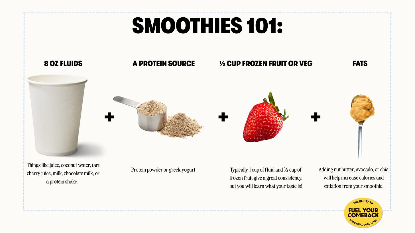 Choose foods that are more bang for your buck in your smoothie: whole milk, whole chocolate milk, juice, etc. and don’t forget to add in the fats.